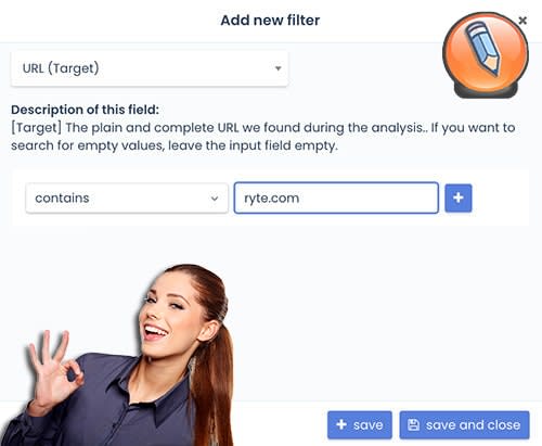 Нажмите «Новый фильтр» и выберите «Домен (цель ссылки)» или «URL (цель ссылки)». Введите имя вашего домена в поле «содержит». Затем нажмите «Сохранить и закрыть».