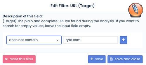 Чтобы найти эти «внешние» битые ссылки, просто измените фильтр. Нажмите «Не содержит» и введите свое доменное имя. После этого Вы увидите все ссылки на внешние сайты.