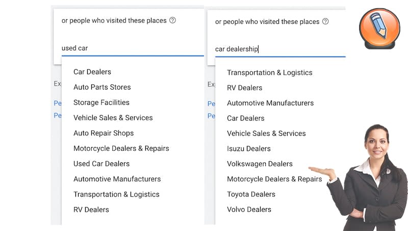 Каждая из них открывала физические локации, которые могли быть весьма ценными. Подержанные автомобили очень актуальны для моих целей вне поиска «подержанные автомобили», но даже в более общем поиске «автосалоны» есть несколько интересных вариантов по конкретным брендам. Если мой гипотетический дилерский центр подержанных автомобилей имеет дело только с одной маркой или если я являюсь менеджером по продаже подержанных автомобилей в представительстве определенной марки, это также может быть отличным вариантом для таргетинга.
